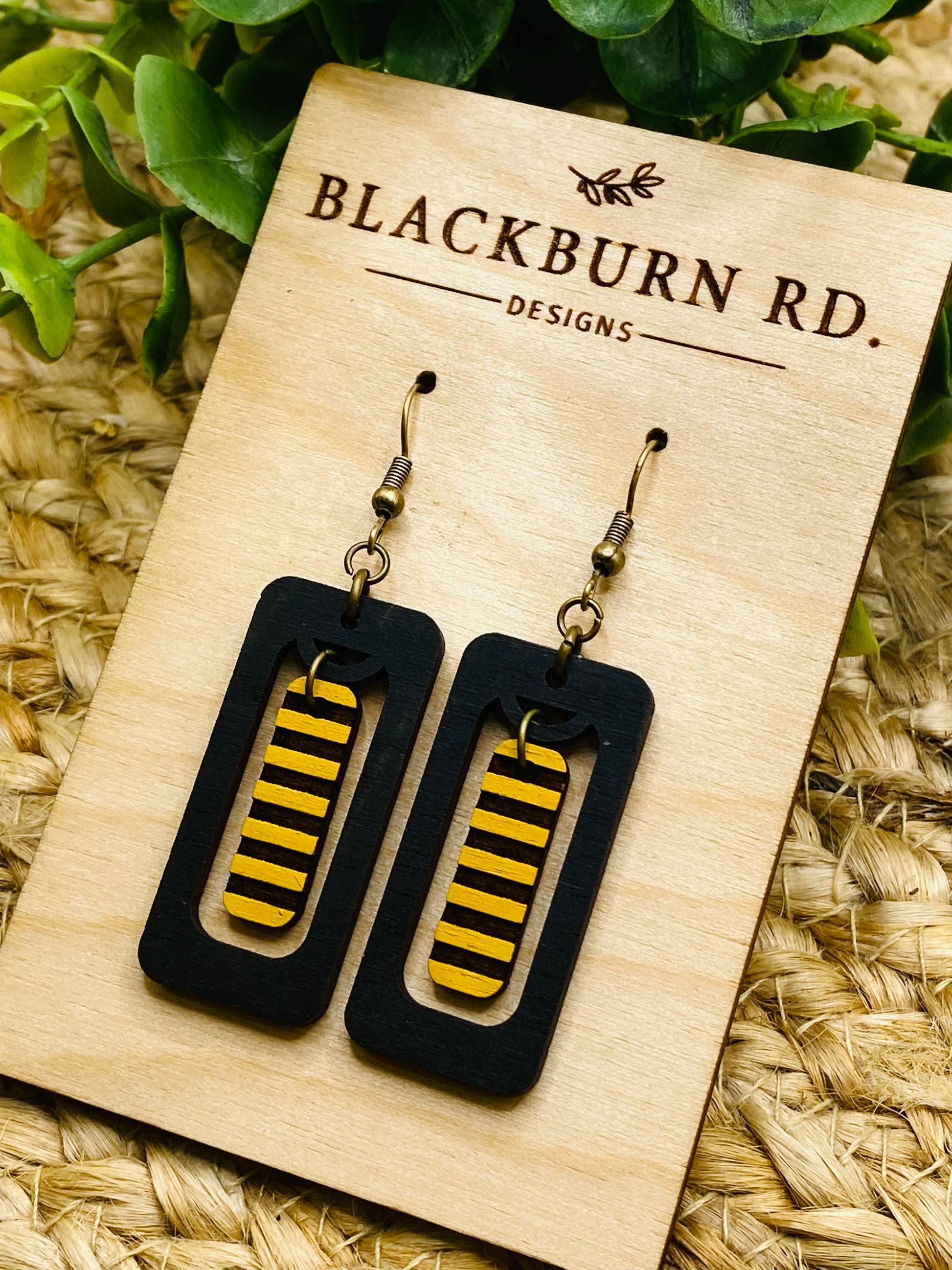 1/8” matte black acrylic with 1/8” laser cut and hand painted white birch. Attached to nickel free bronze hardware. Approximately 1.65” in length.