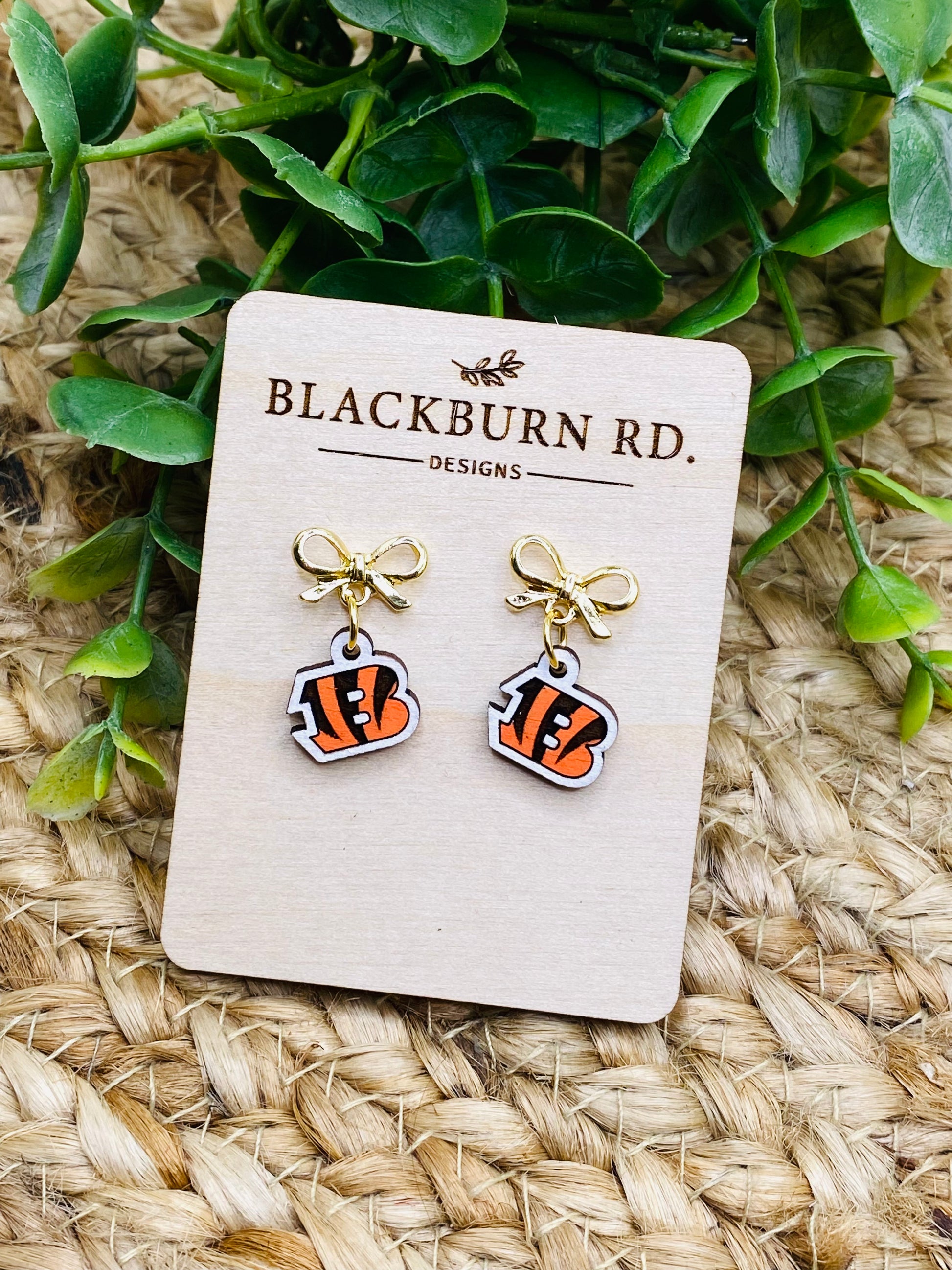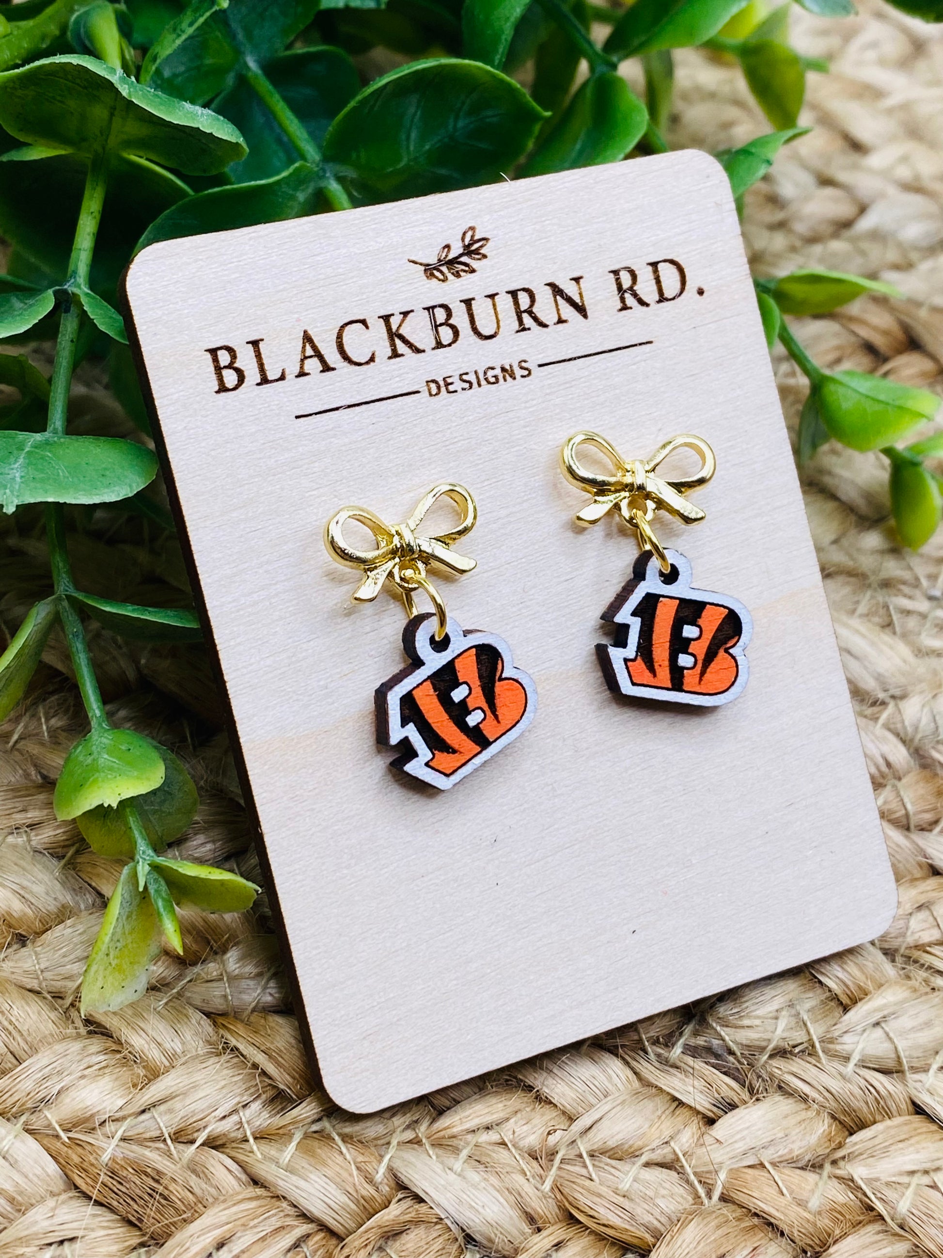 The perfect little Bengals earrings! These very petite dangles measure approximately .5” in length. Hand painted and stained back, attached to stainless steel gold bow earring post.