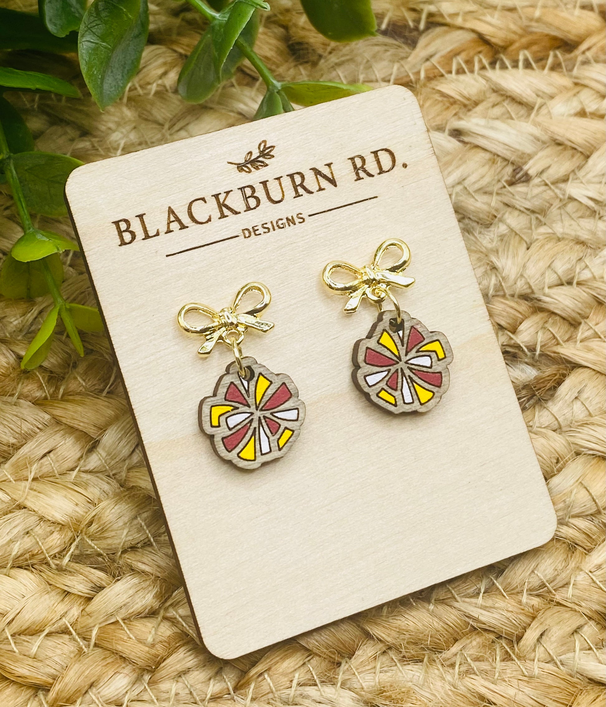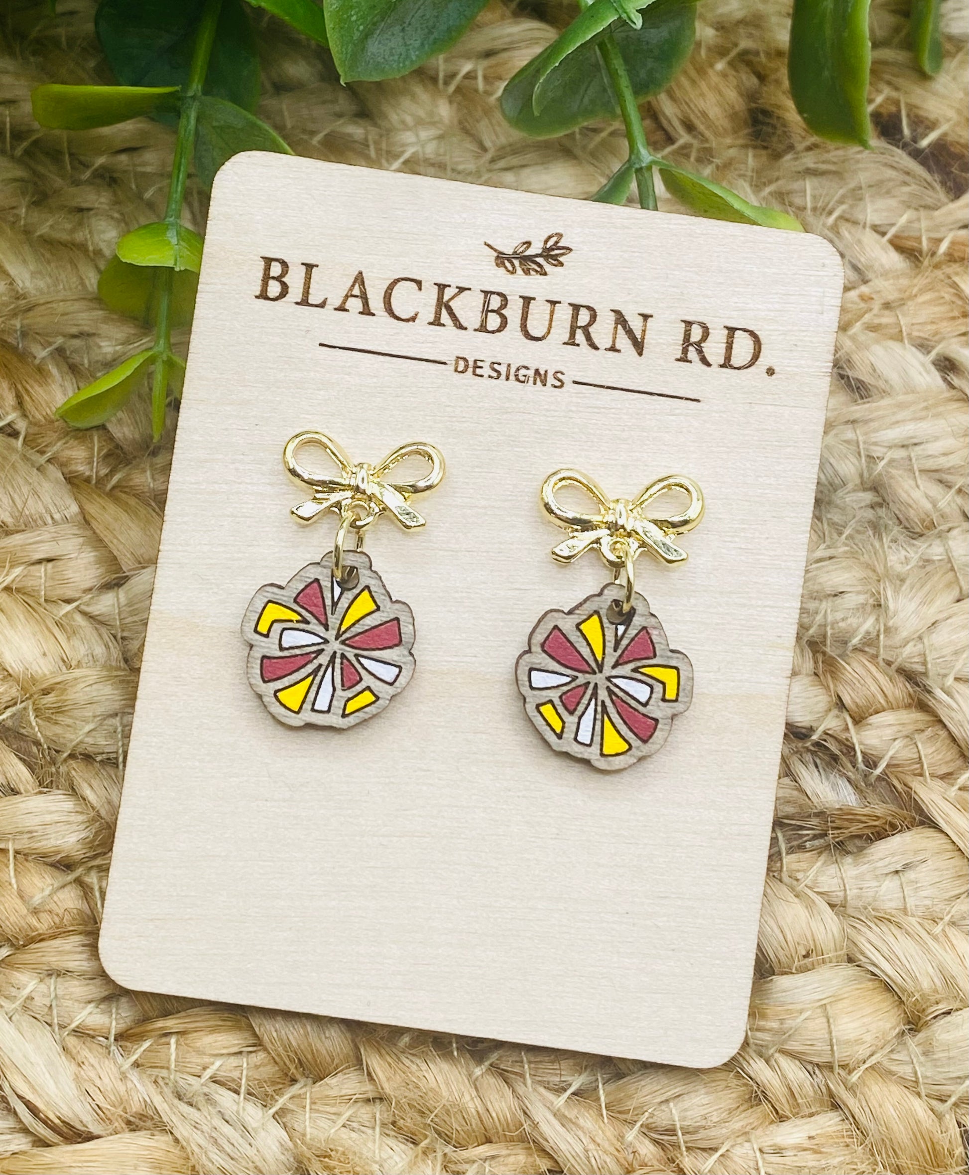 Attached to stainless steel gold plated bow earring post. Earrings are approximately .60” in length.