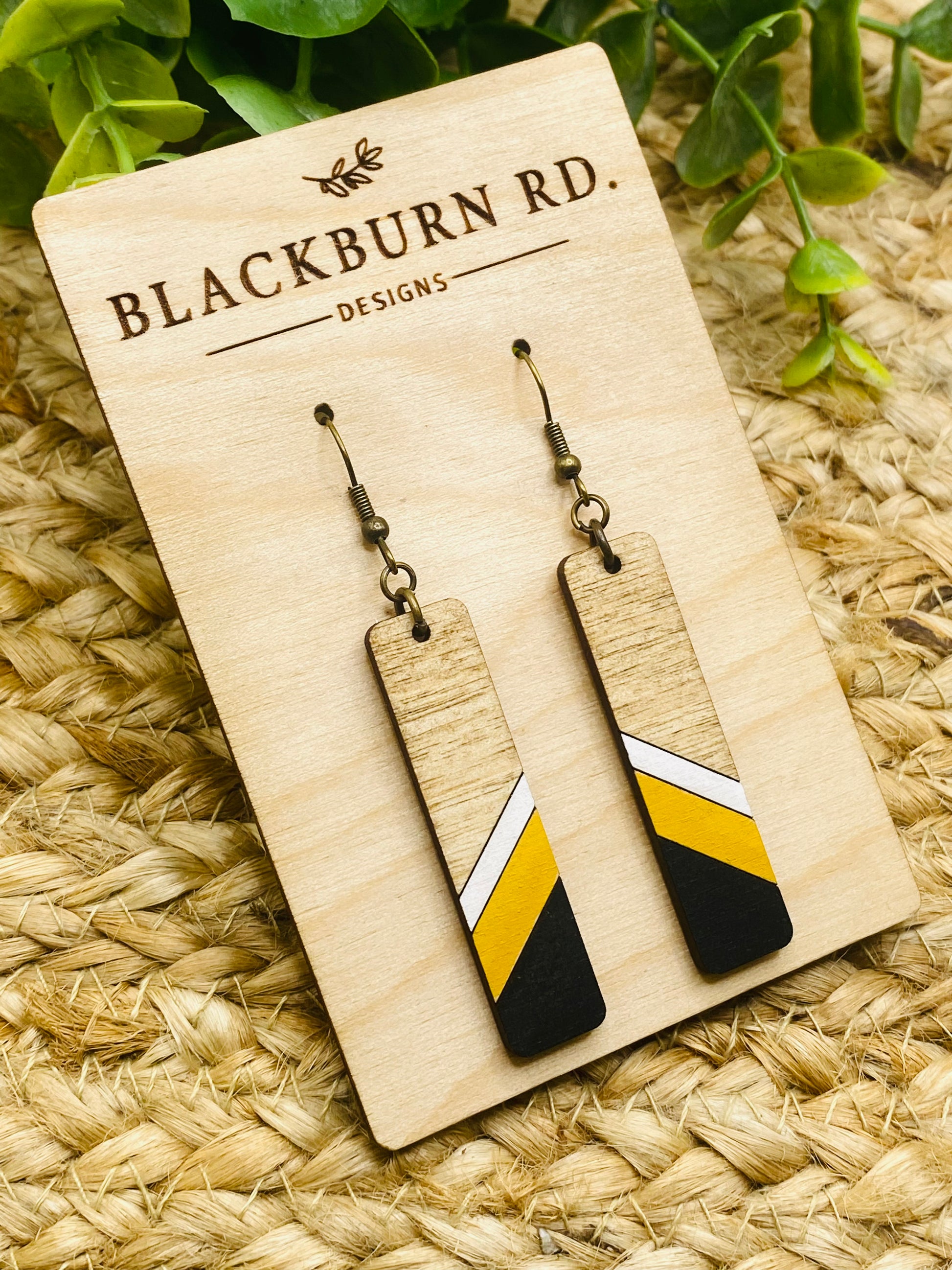 Laser cut, hand painted and stained 1/8” white birch. Attached to nickel free bronze hardware. Approximately 1.75” in length.